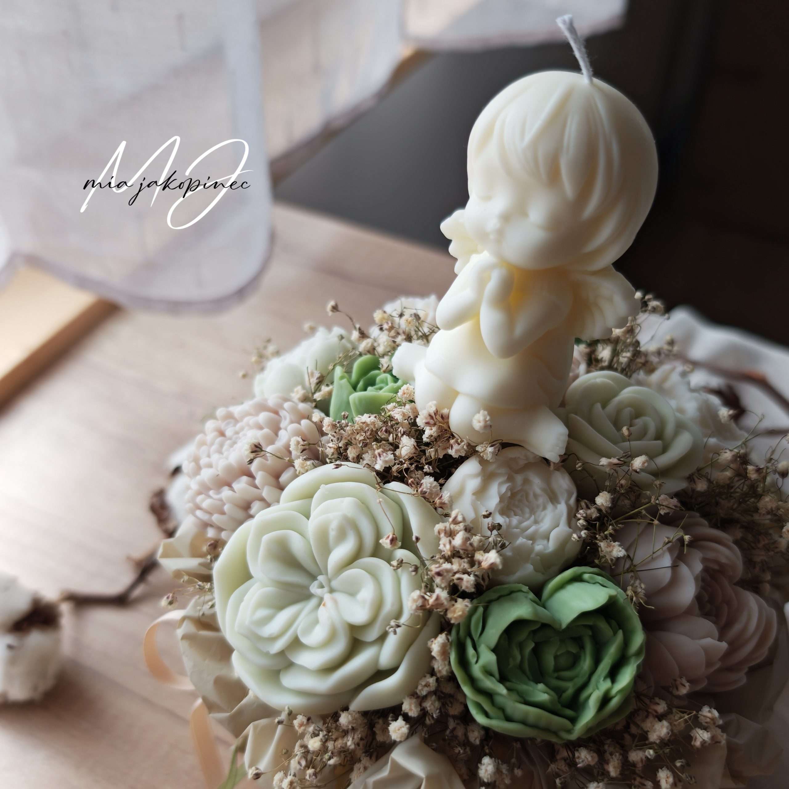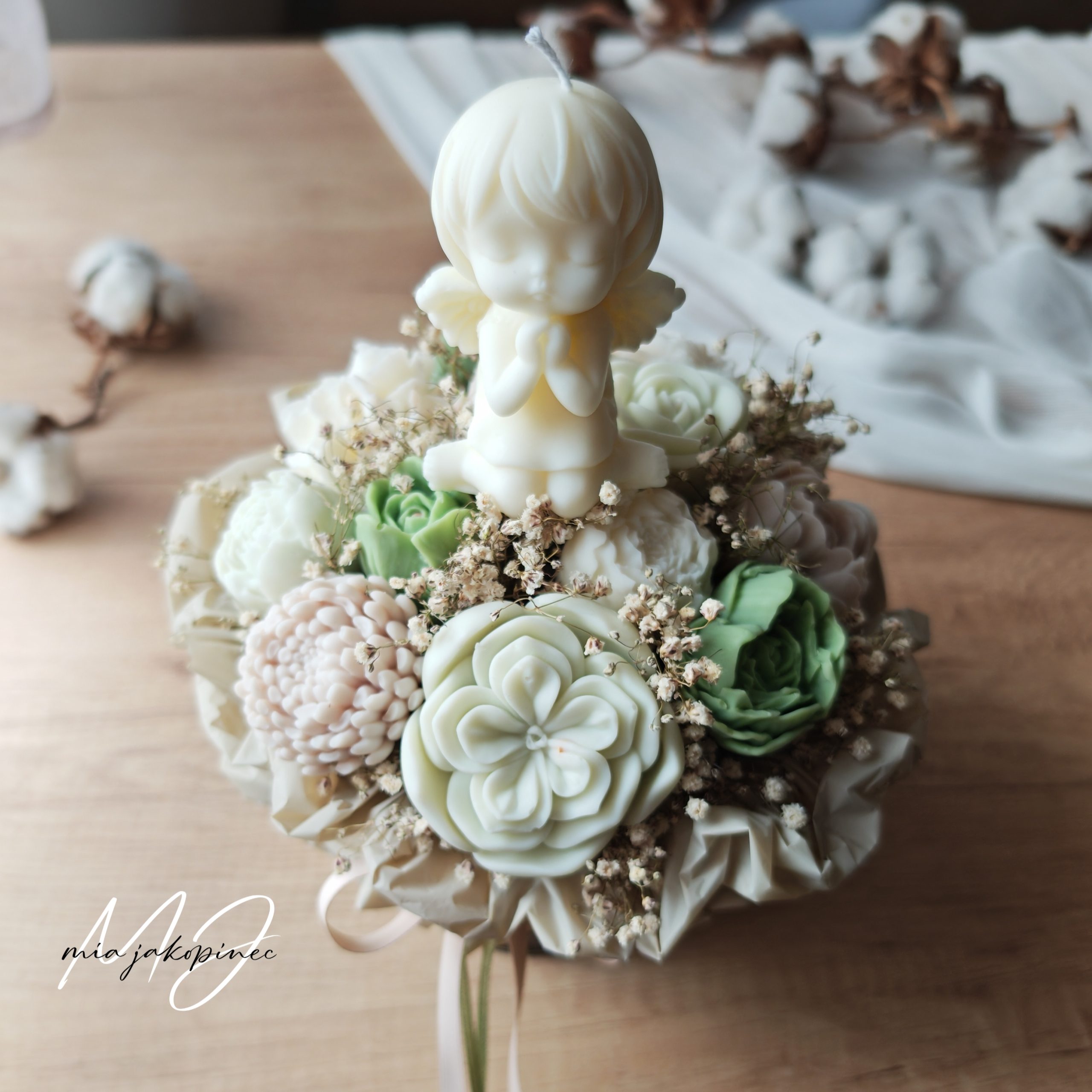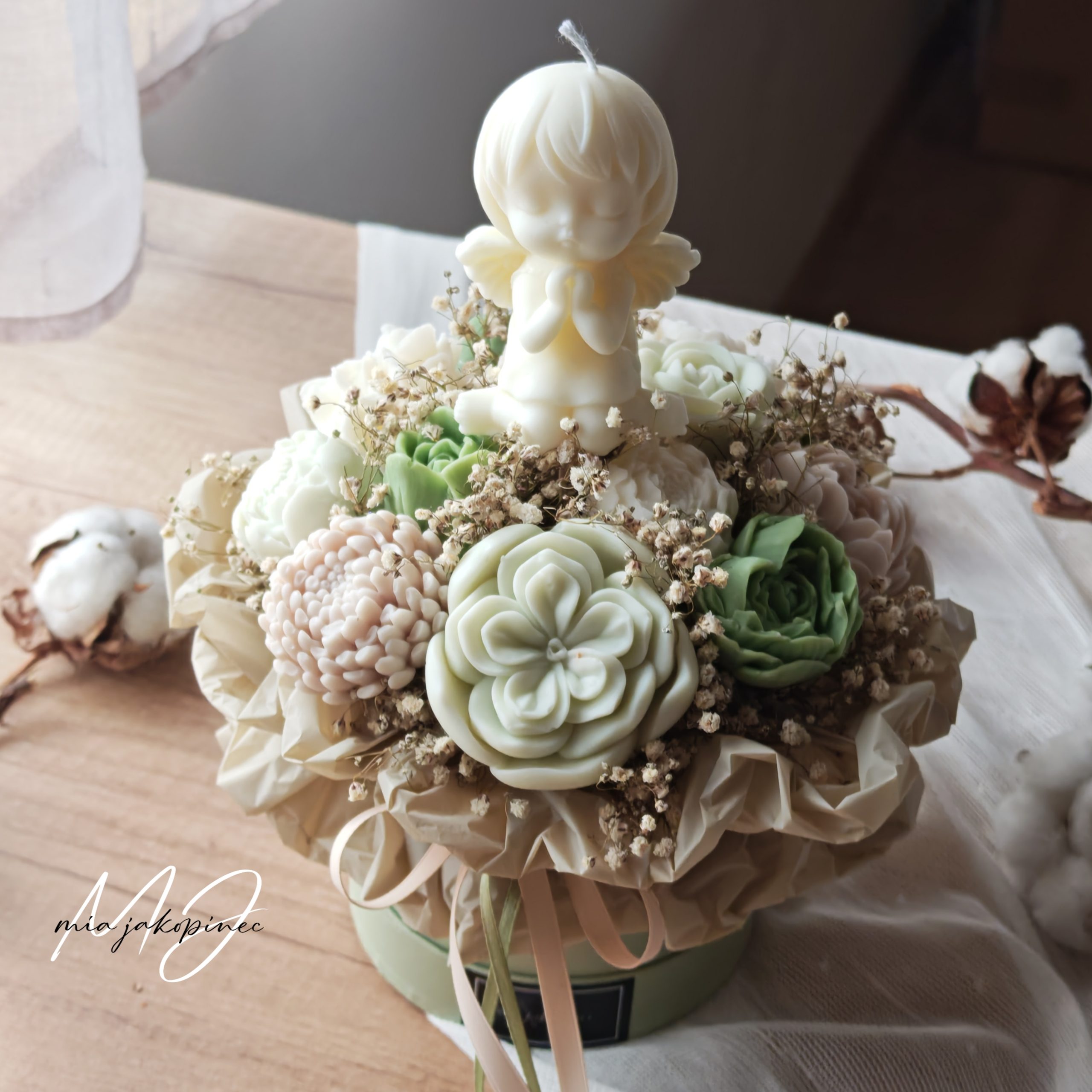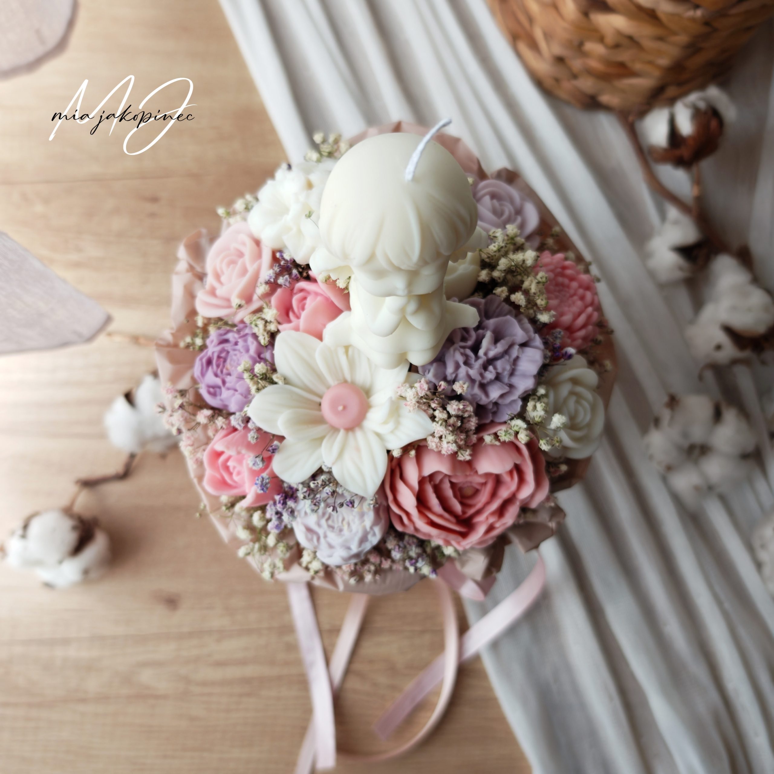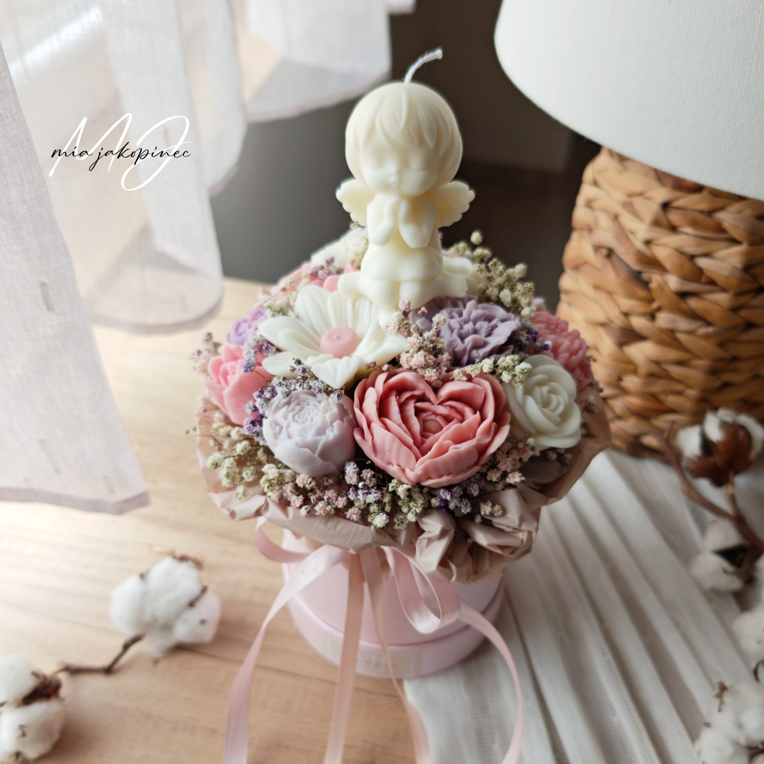 Box od sojinog mirisnog voska i suhog cvijeca. Dugotrajan mirisni aranzman. Boje i vrsta cvijeca variraju od buketa do buketa.