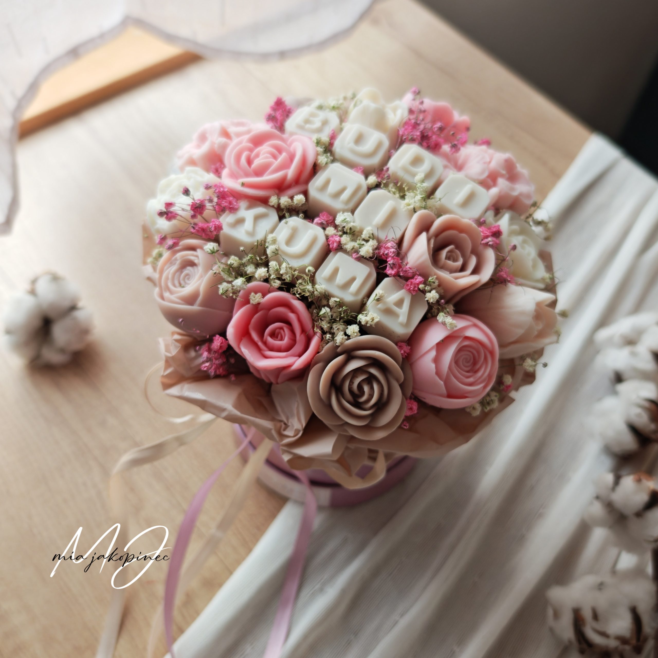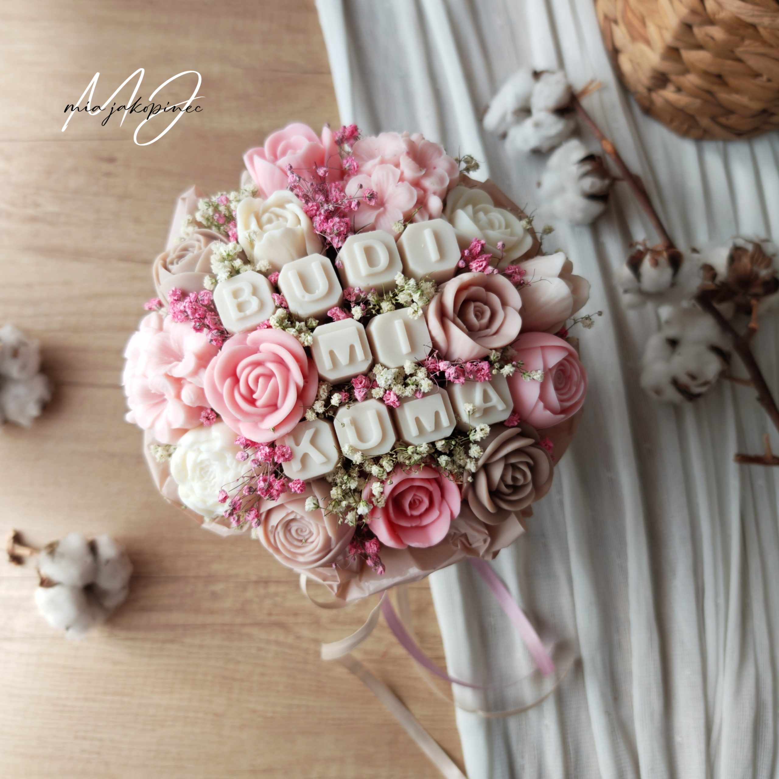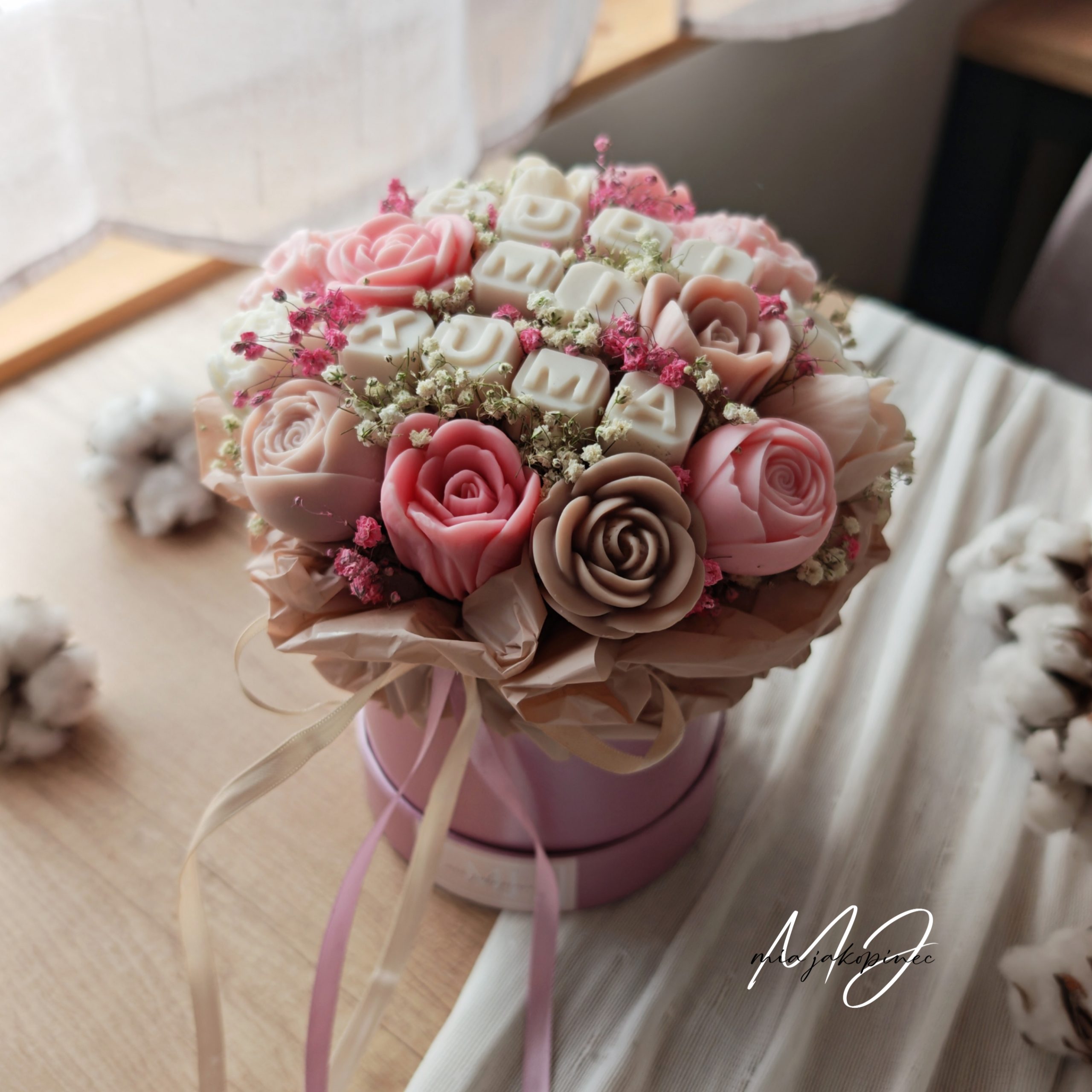 Box od sojinog mirisnog voska i suhog cvijeca. Dugotrajan mirisni buket.  Boje i vrsta cvijeca variraju od buketa do buket. Velicina je jedinicna.
