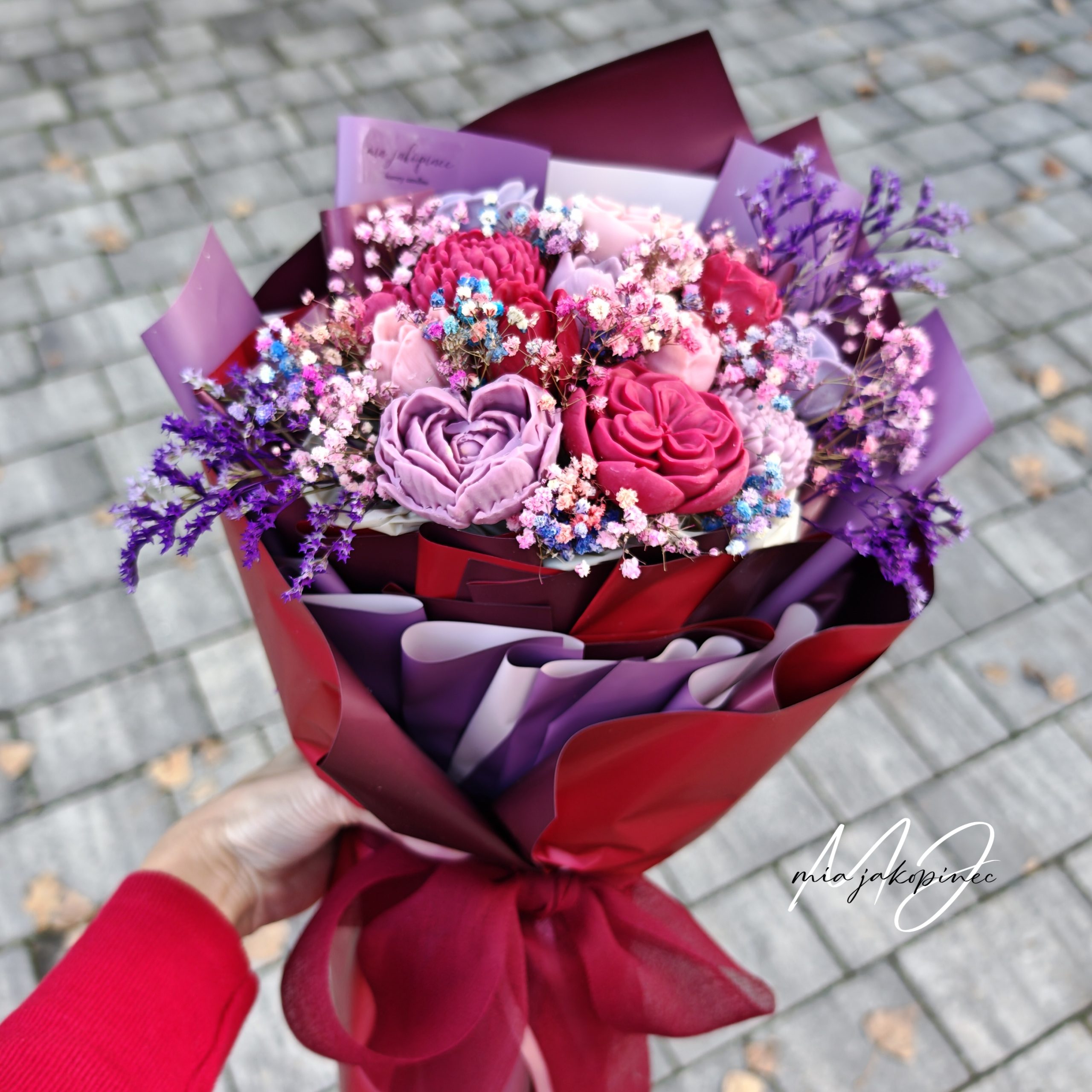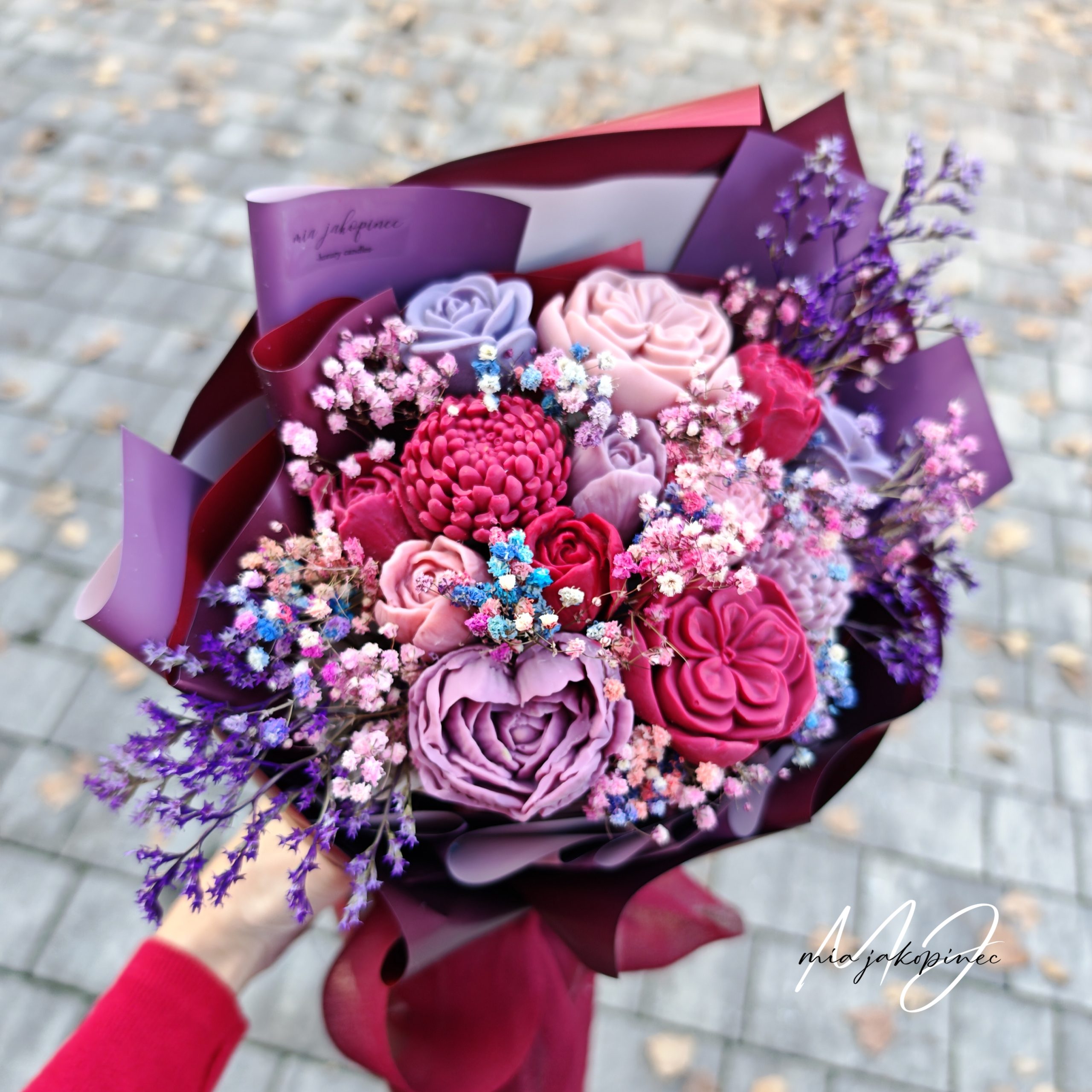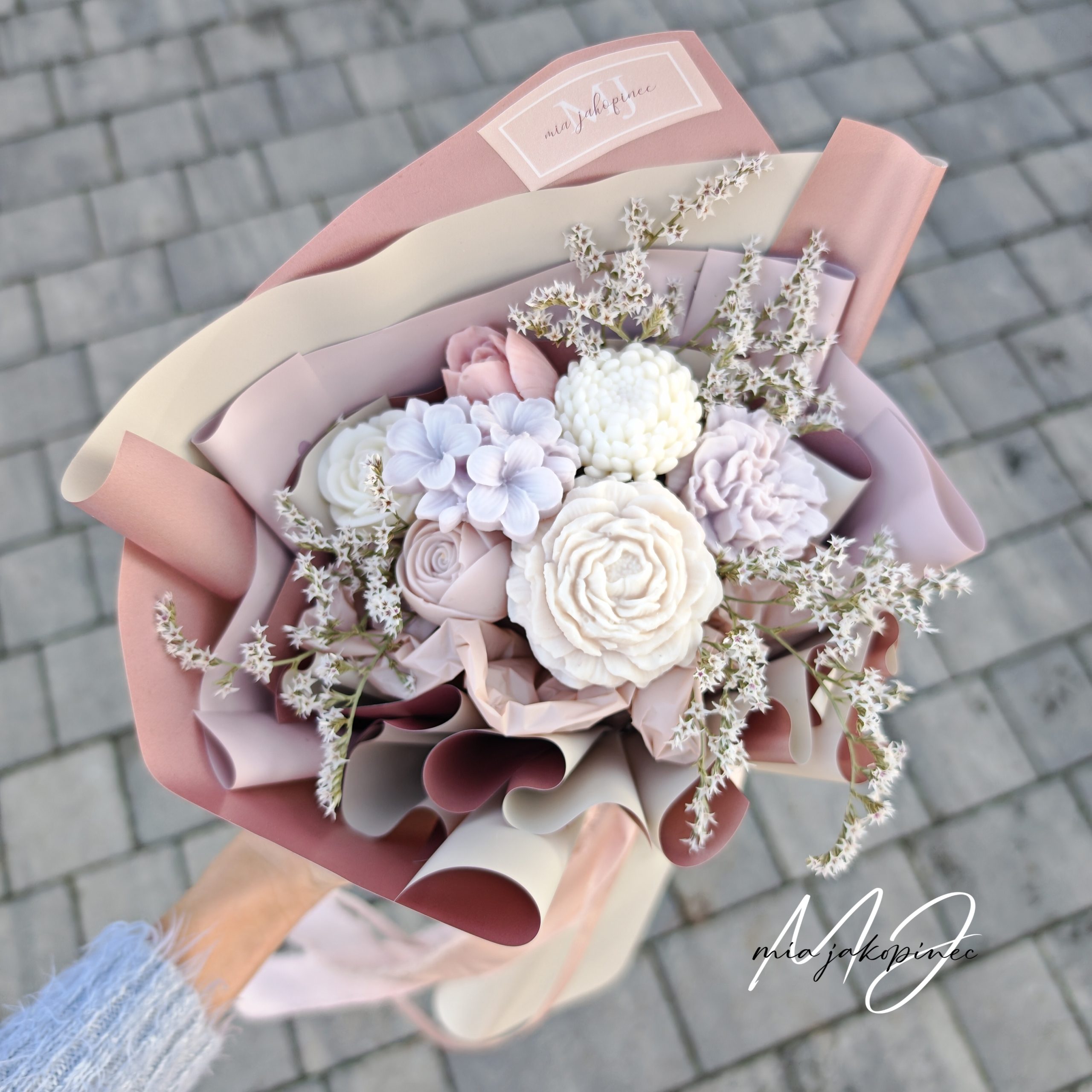 Buket od sojinog mirisnog voska i suhog cvijeca. Dugotrajan mirisni buket. Boje i vrsta cvijeca variraju od buketa do buketa.