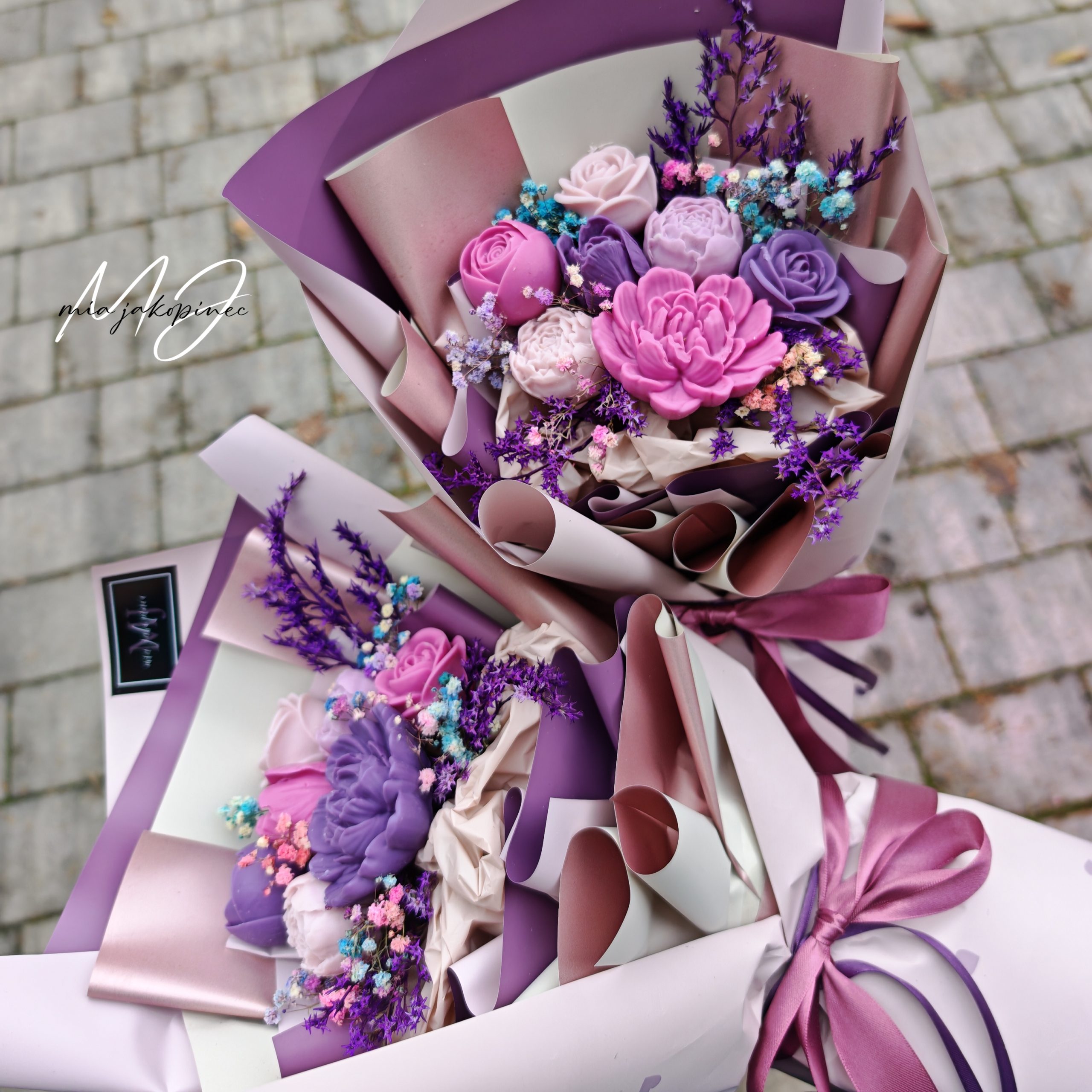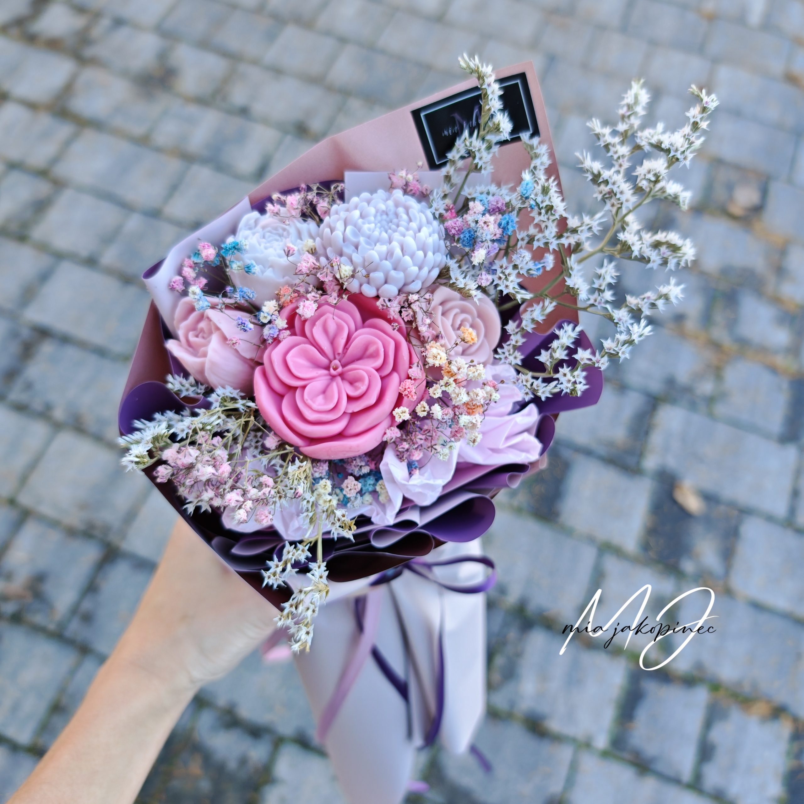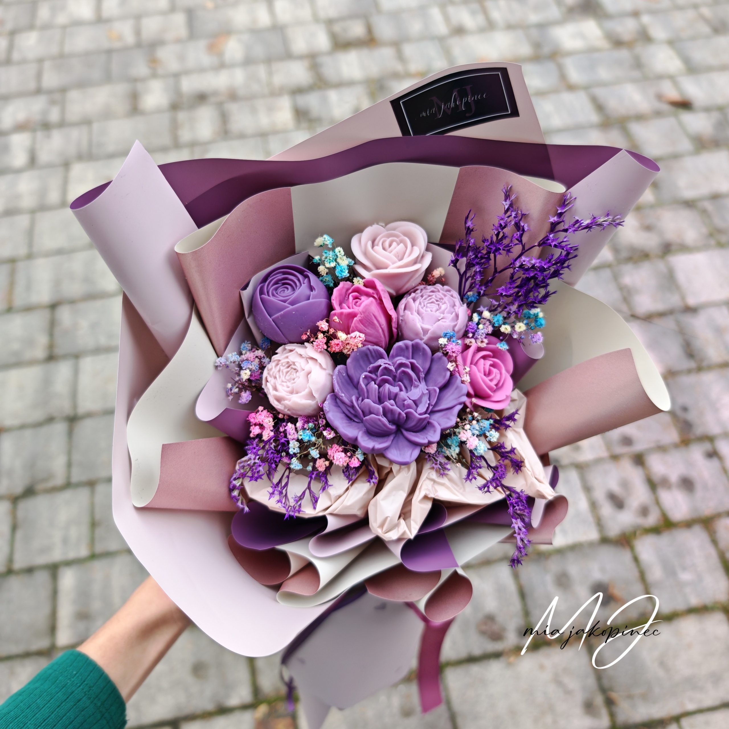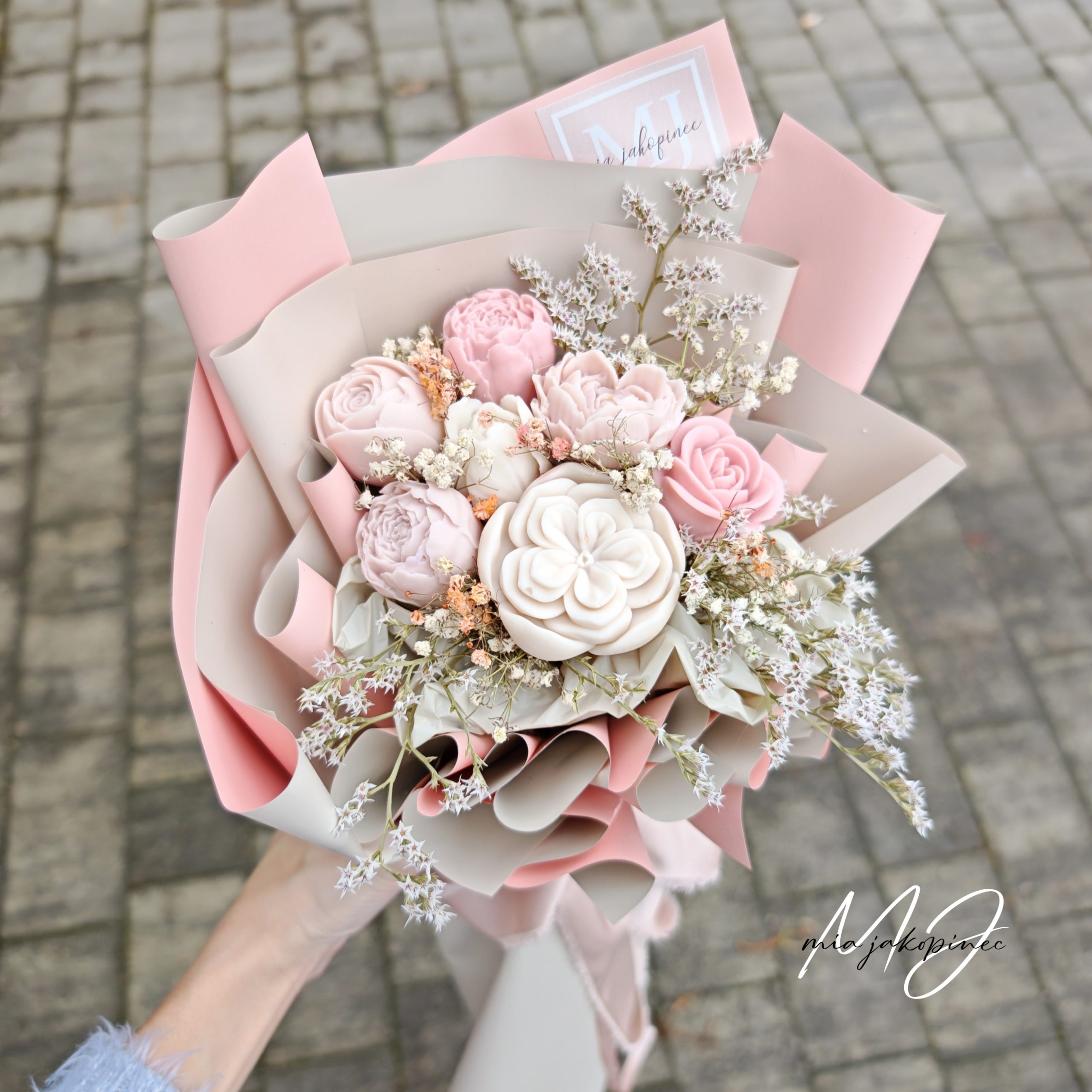 Buket od sojinog mirisnog voska i suhog cvijeca. Dugotrajan mirisni buket. Boje i vrsta cvijeca variraju od buketa do buketa.