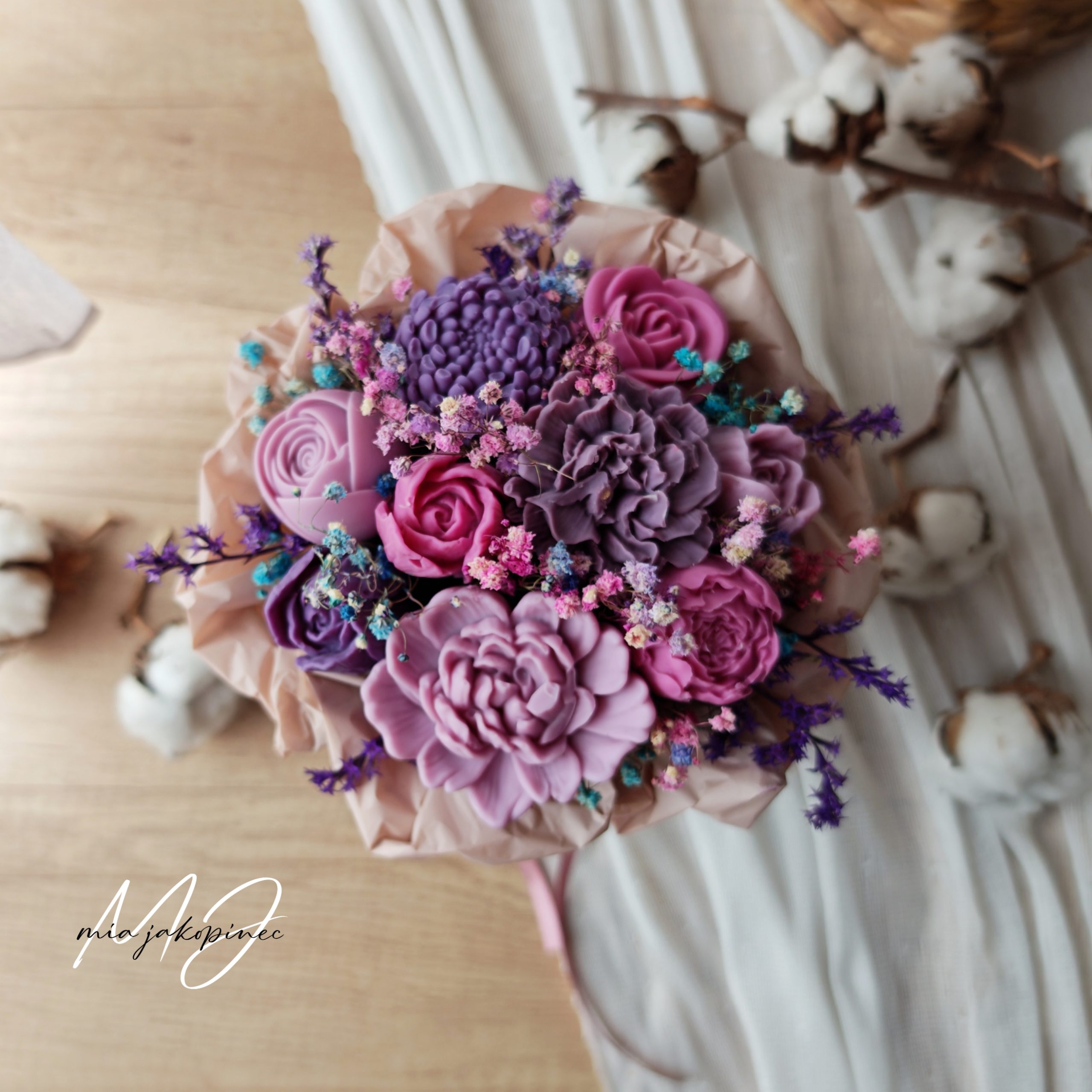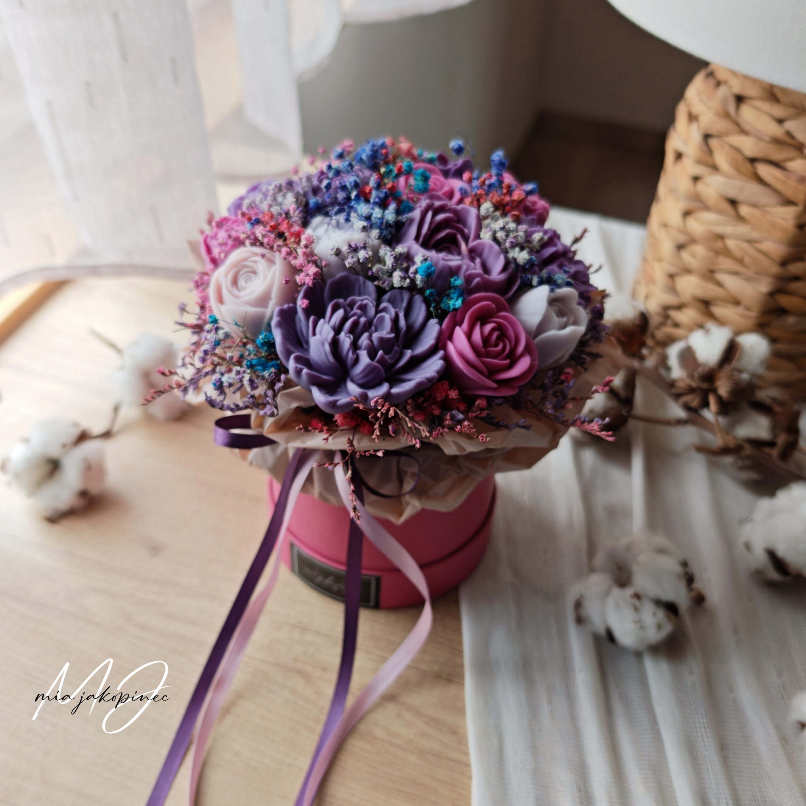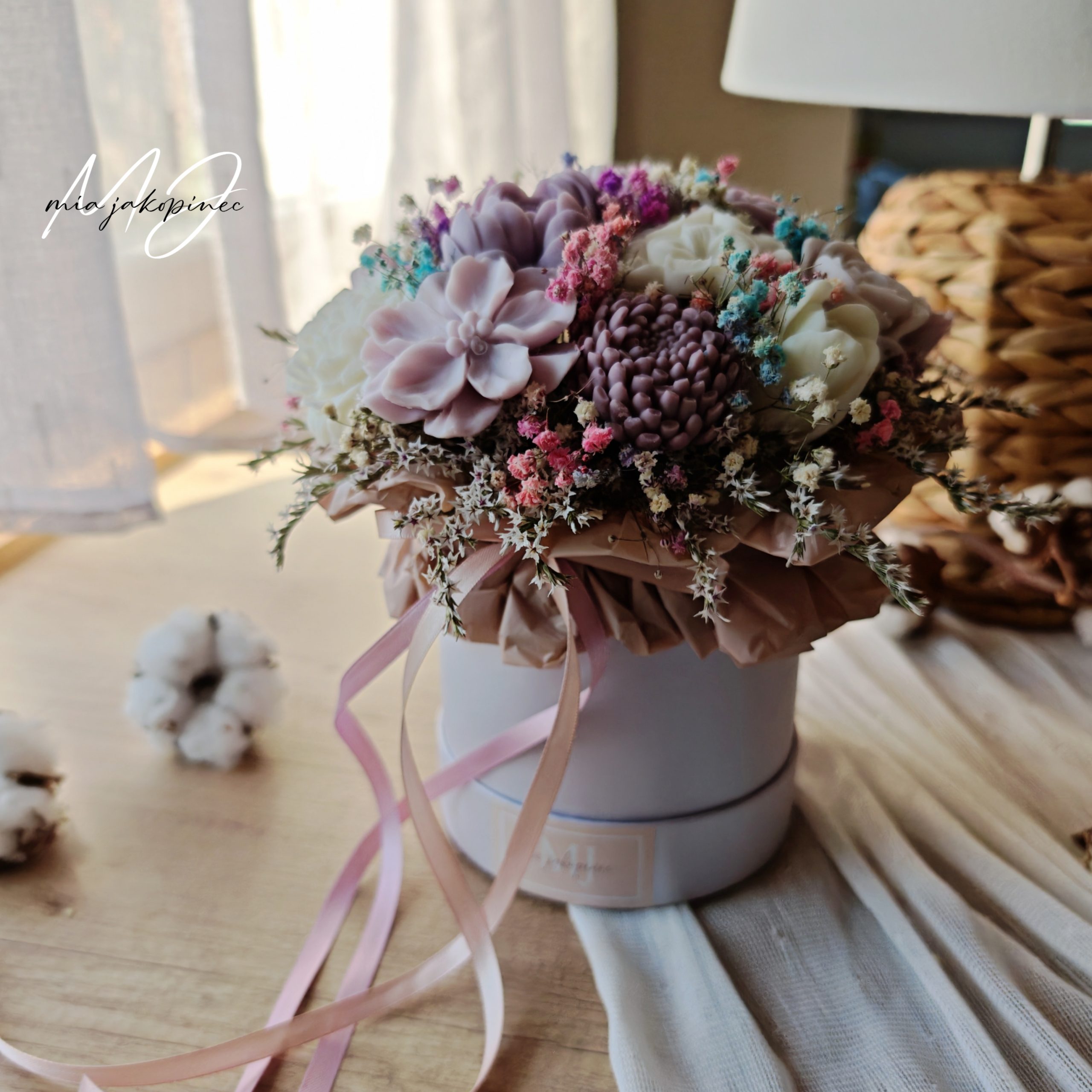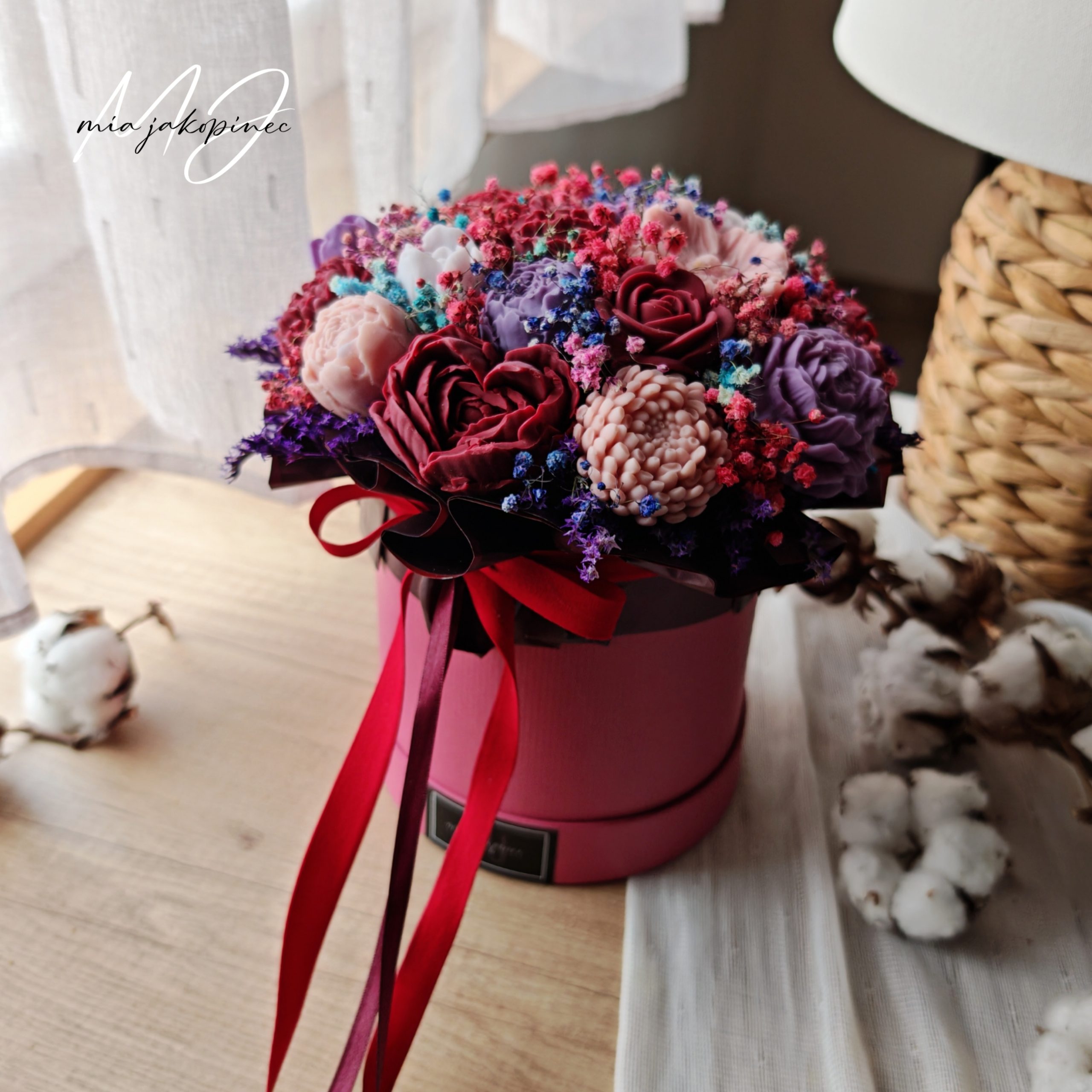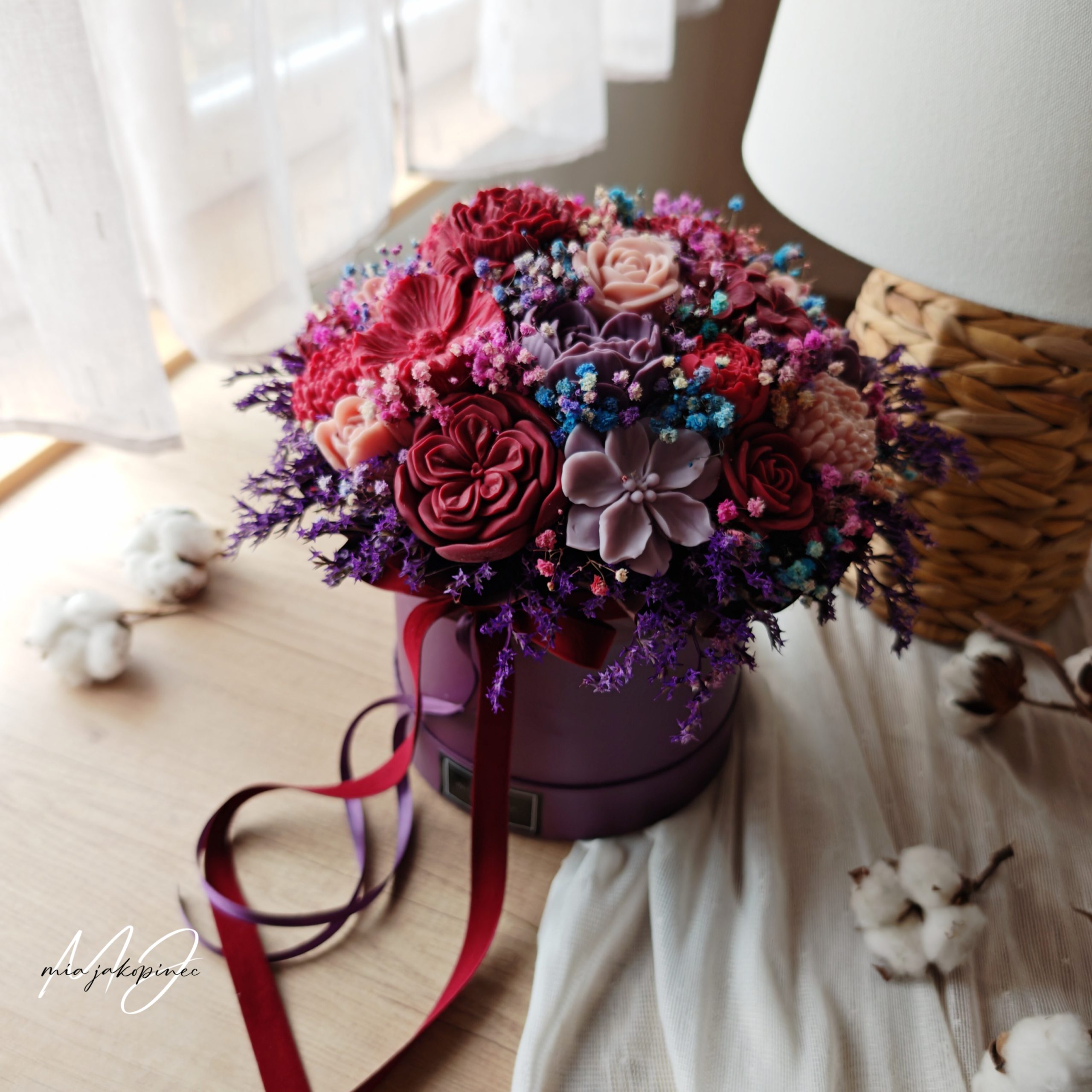 Box od sojinog mirisnog voska i suhog cvijeca. Dugotrajan mirisni aranzman. Boje i vrsta cvijeca variraju od buketa do buketa.