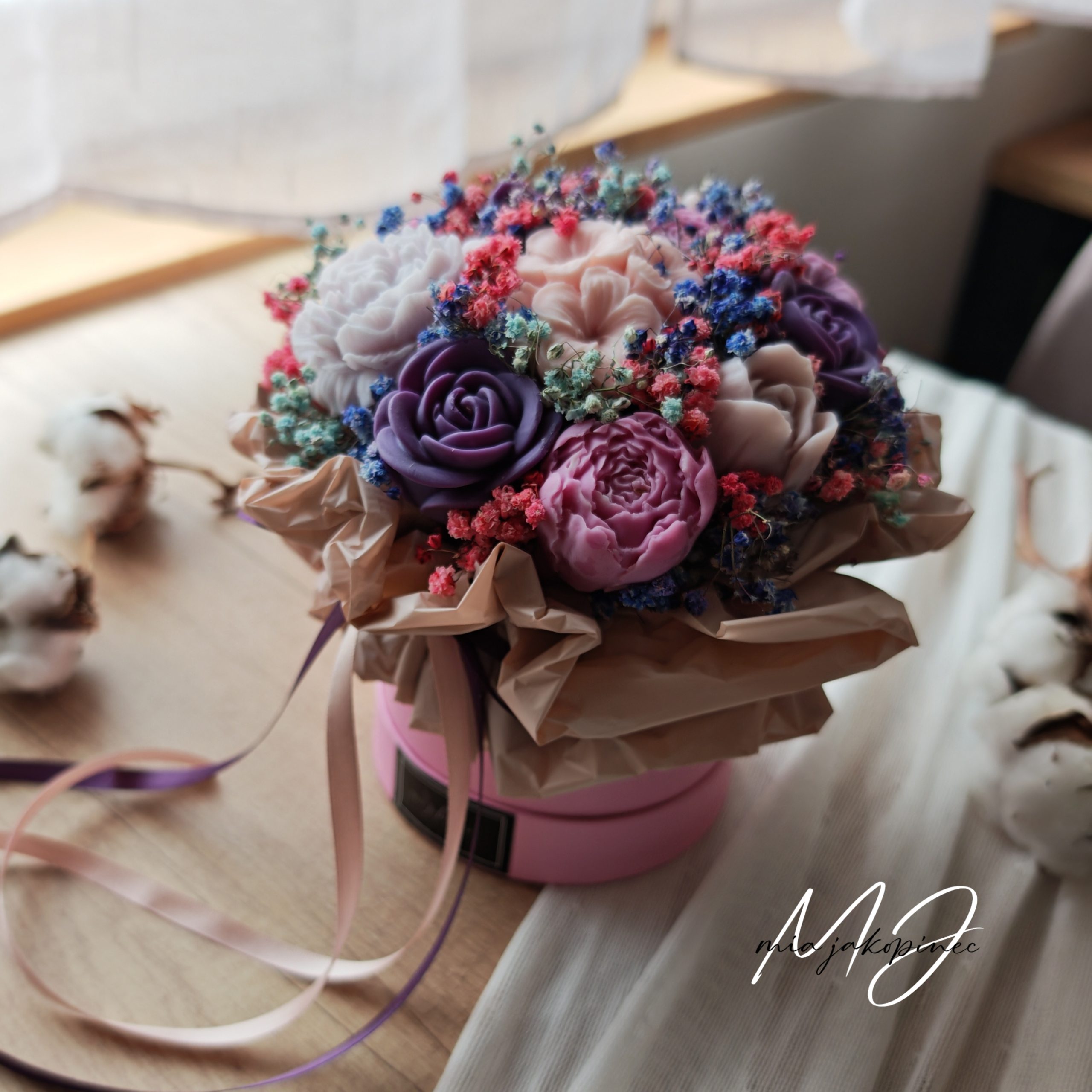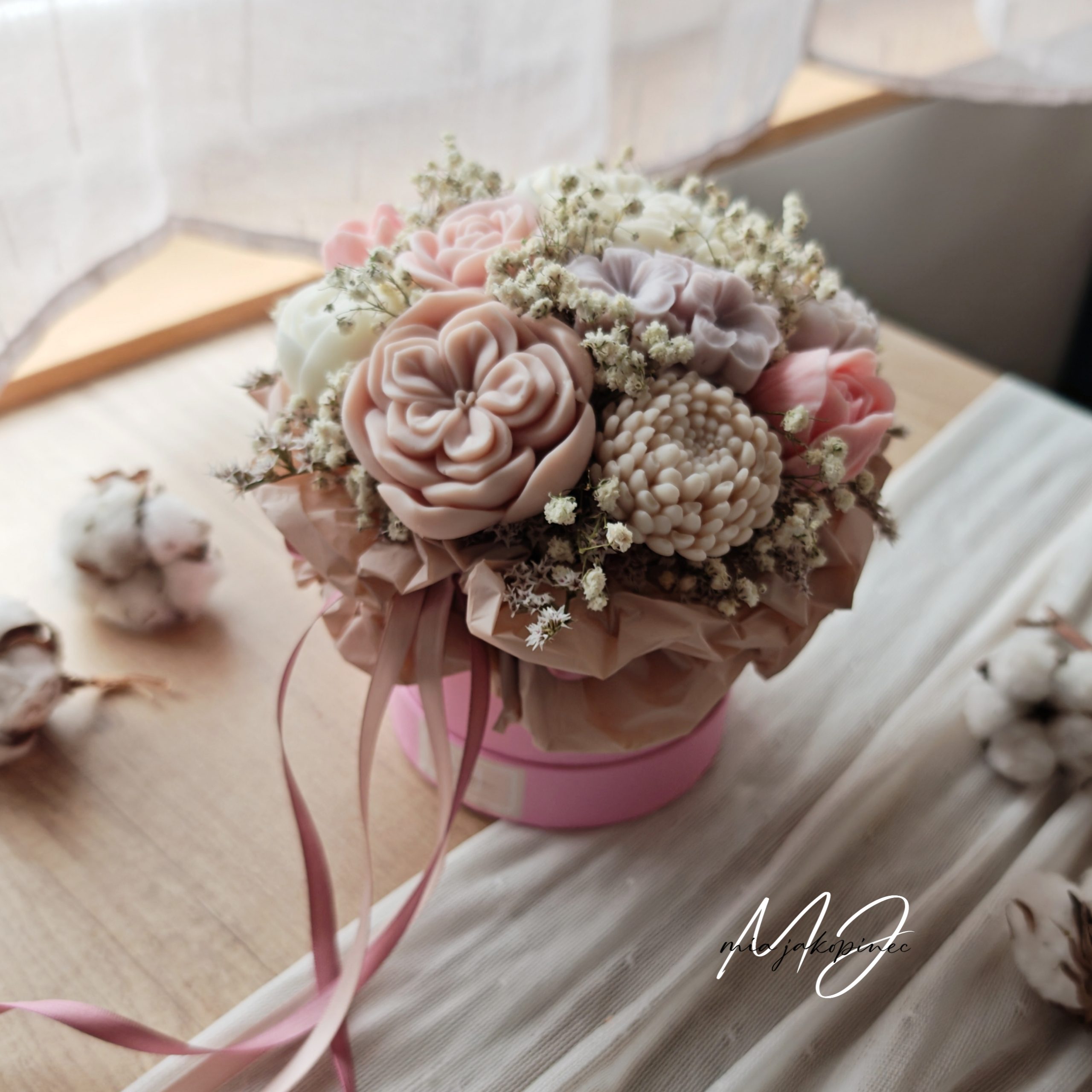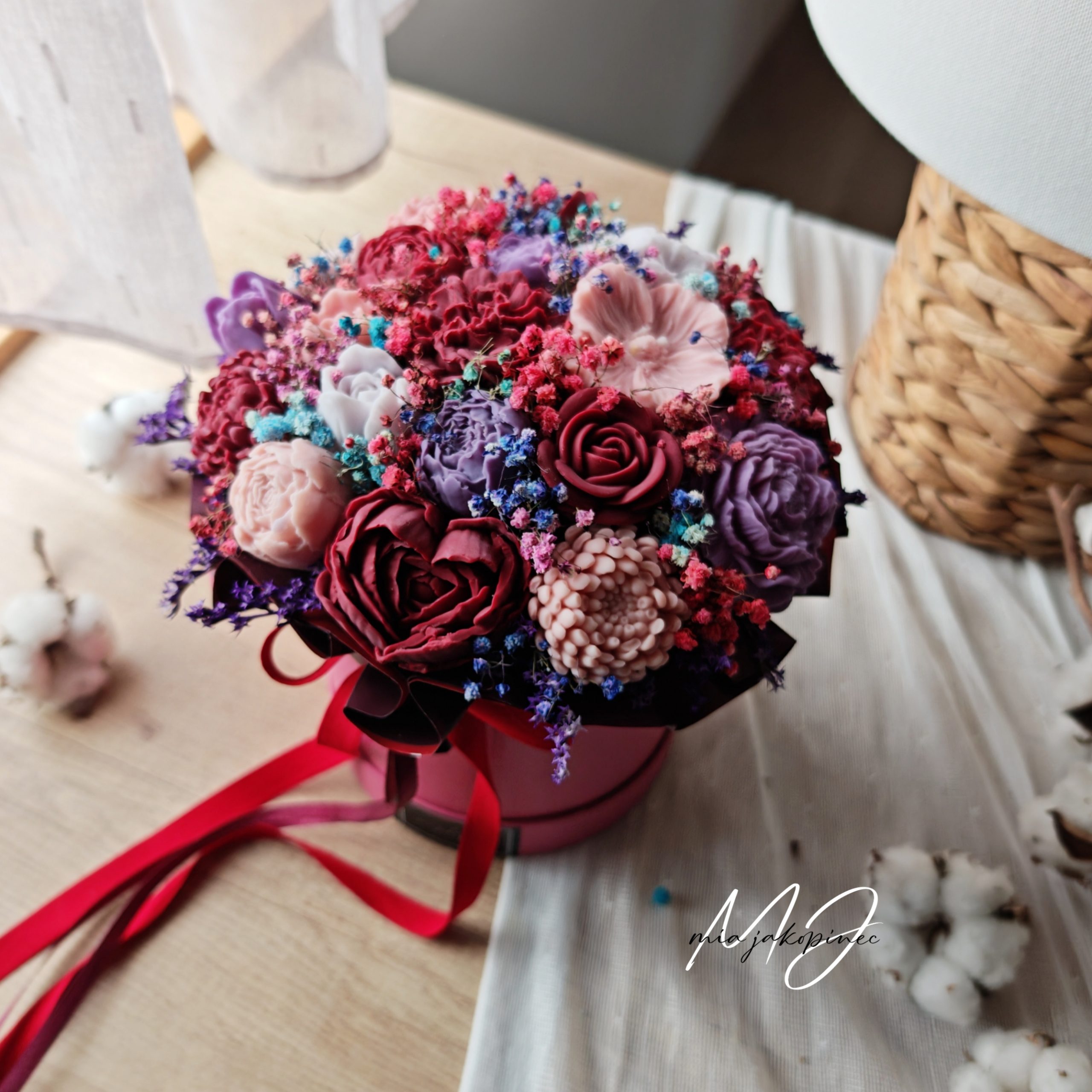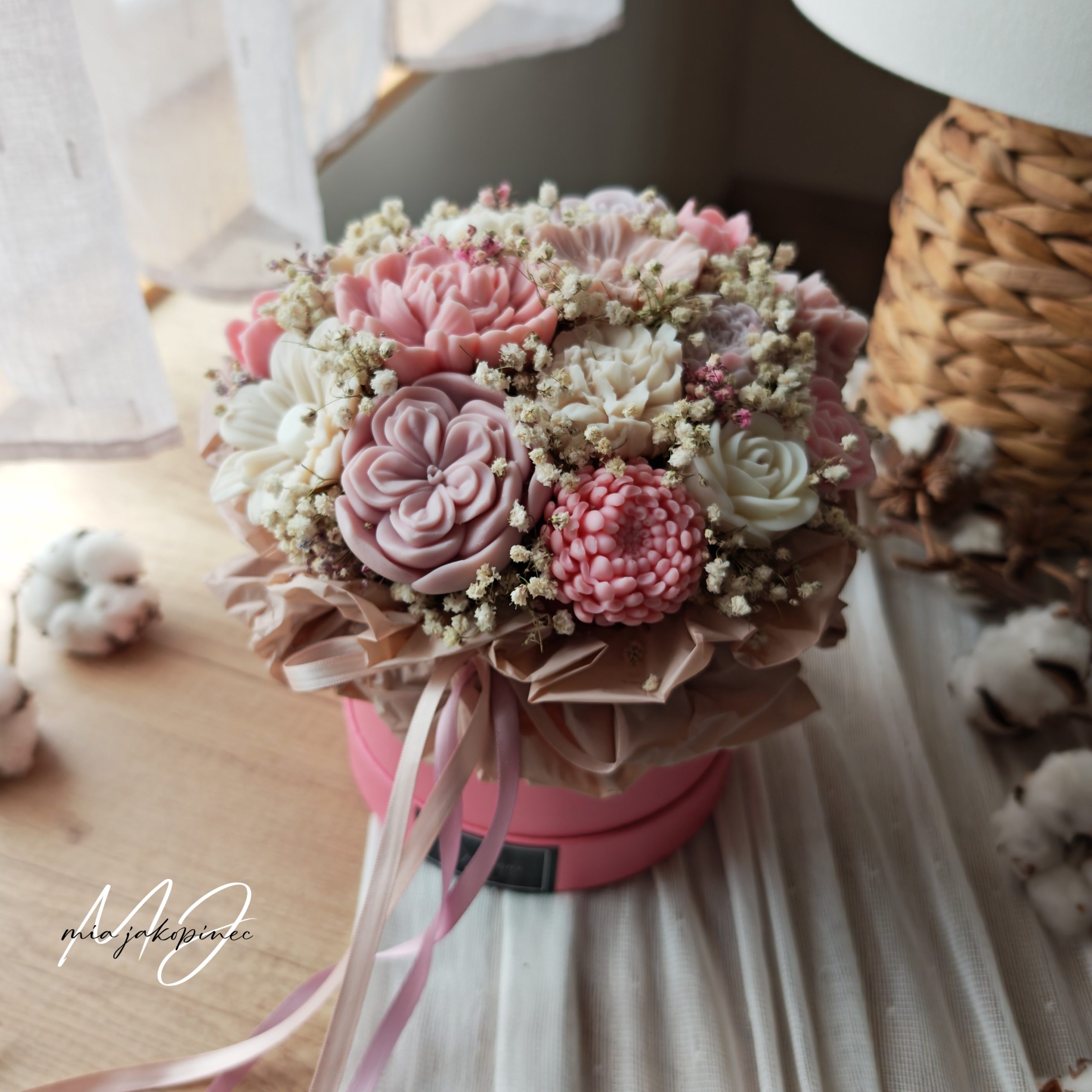 Box od sojinog mirisnog voska i suhog cvijeca. Dugotrajan mirisni aranzman. Boje i vrsta cvijeca variraju od buketa do buketa.