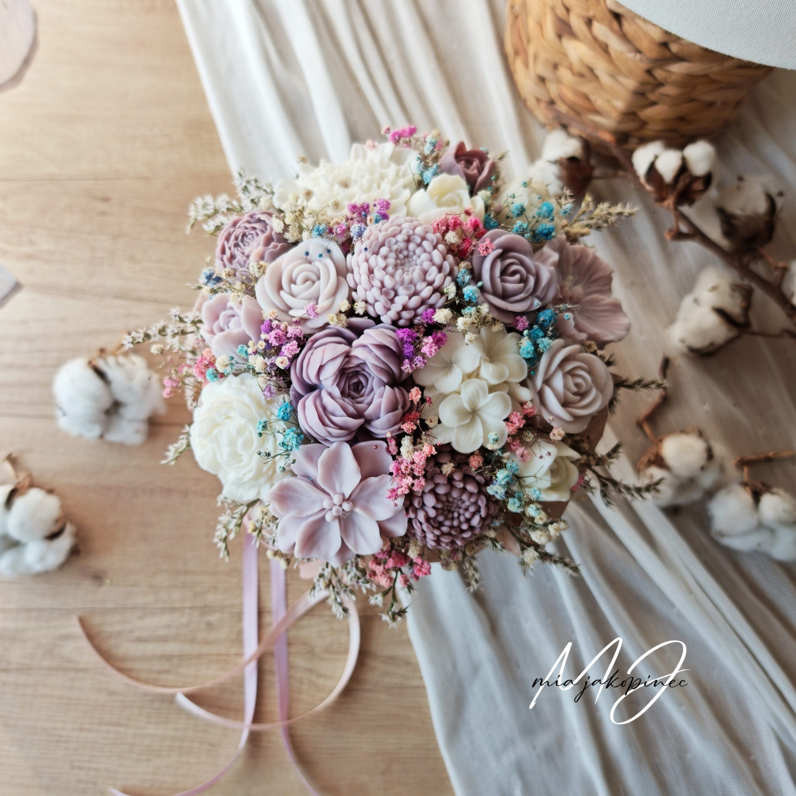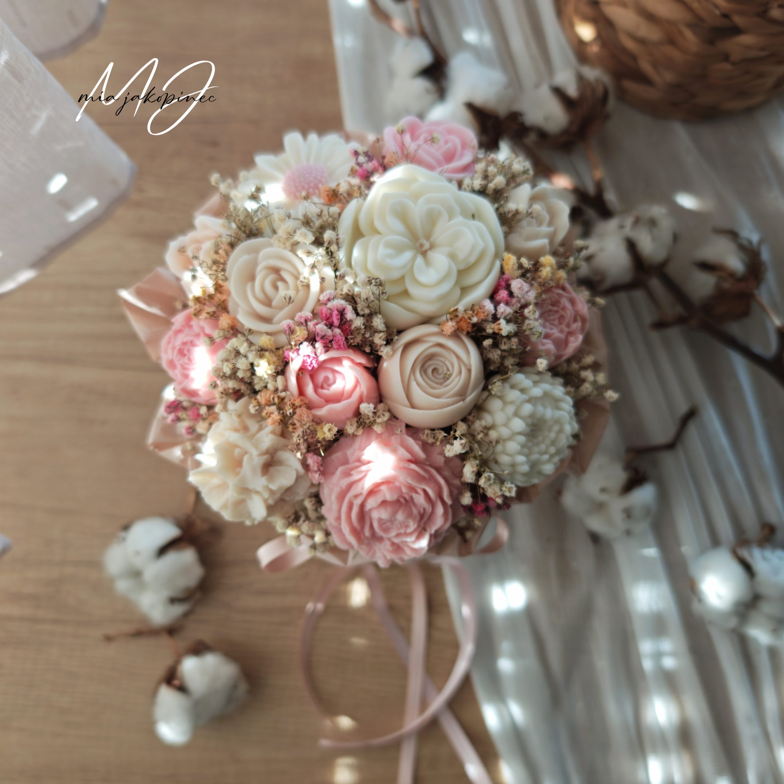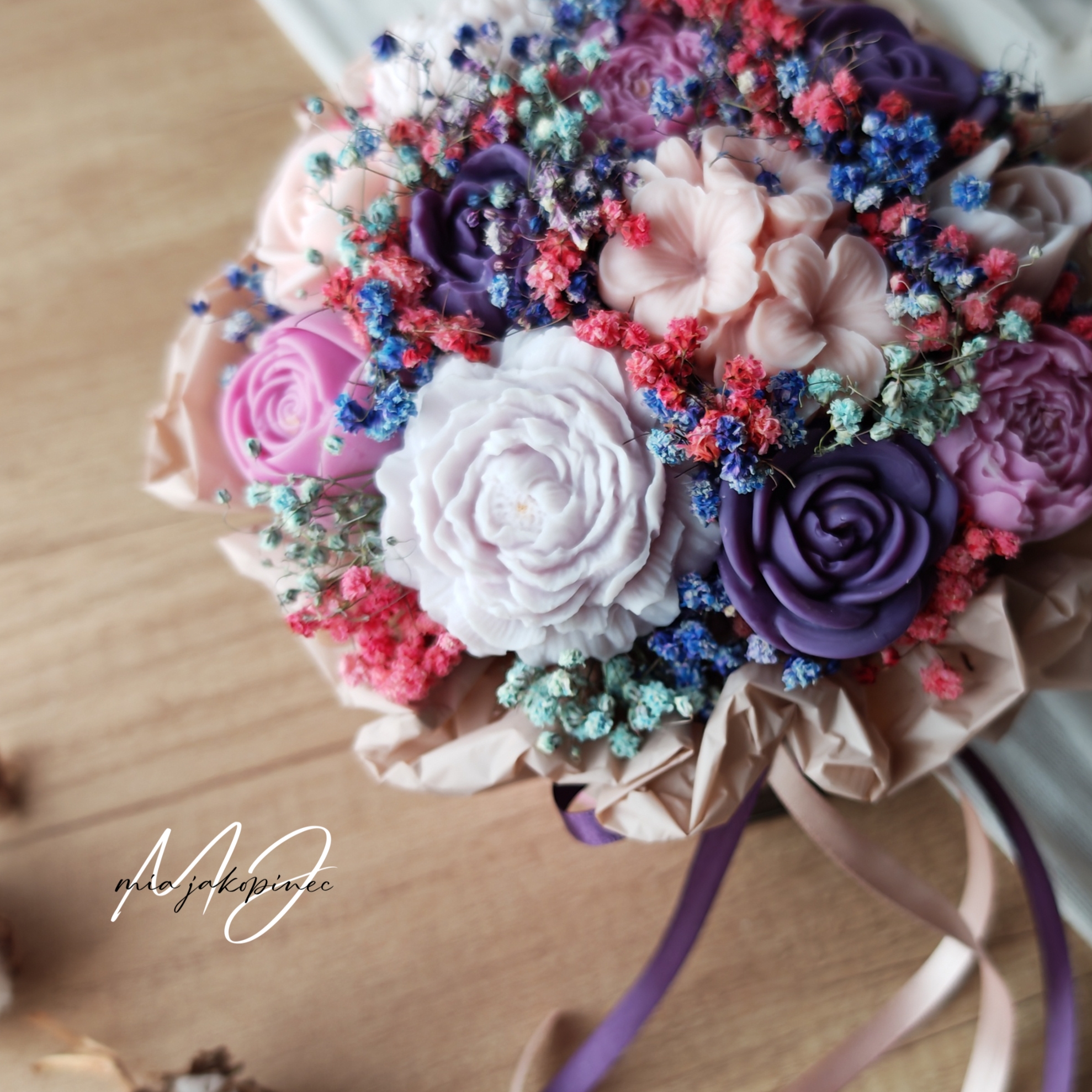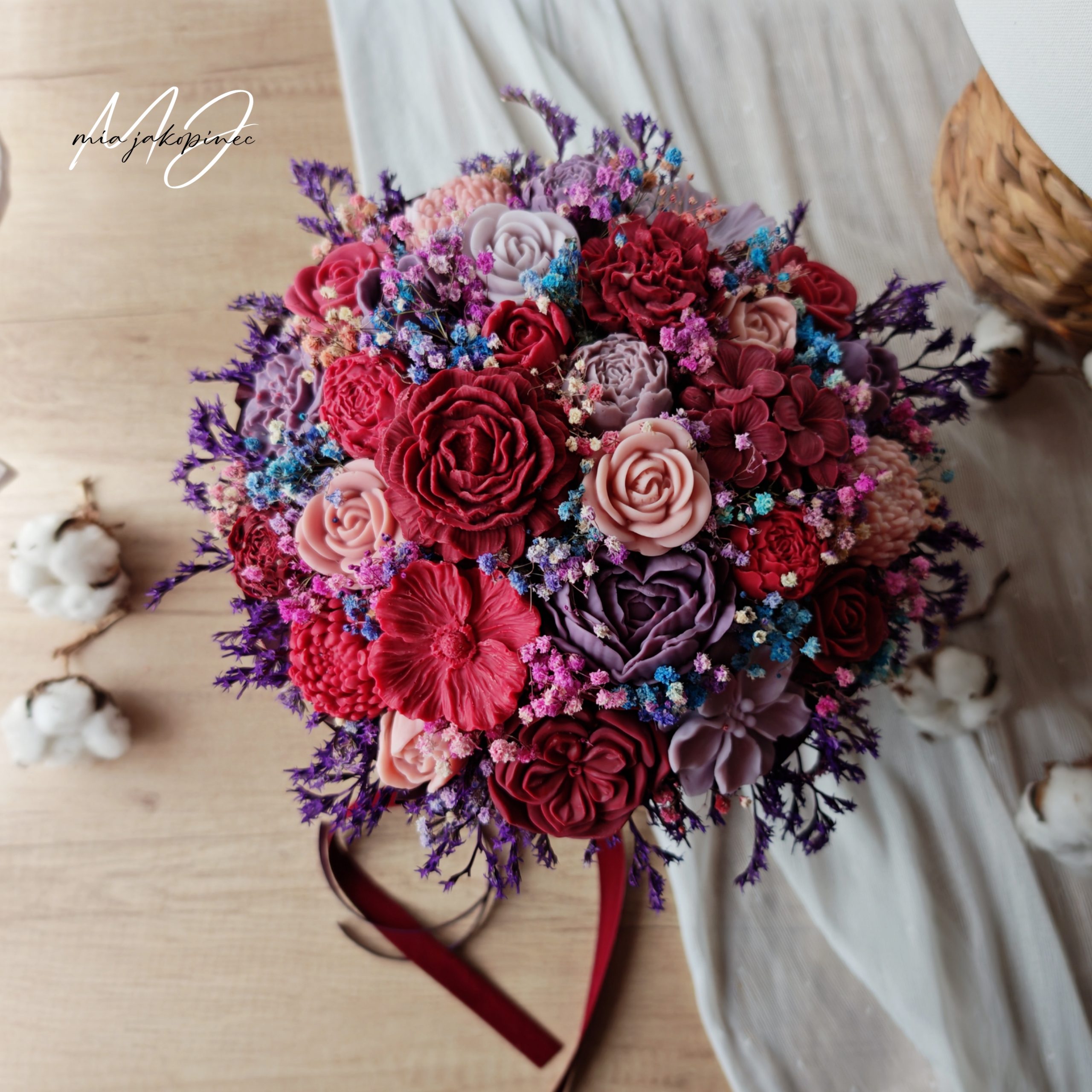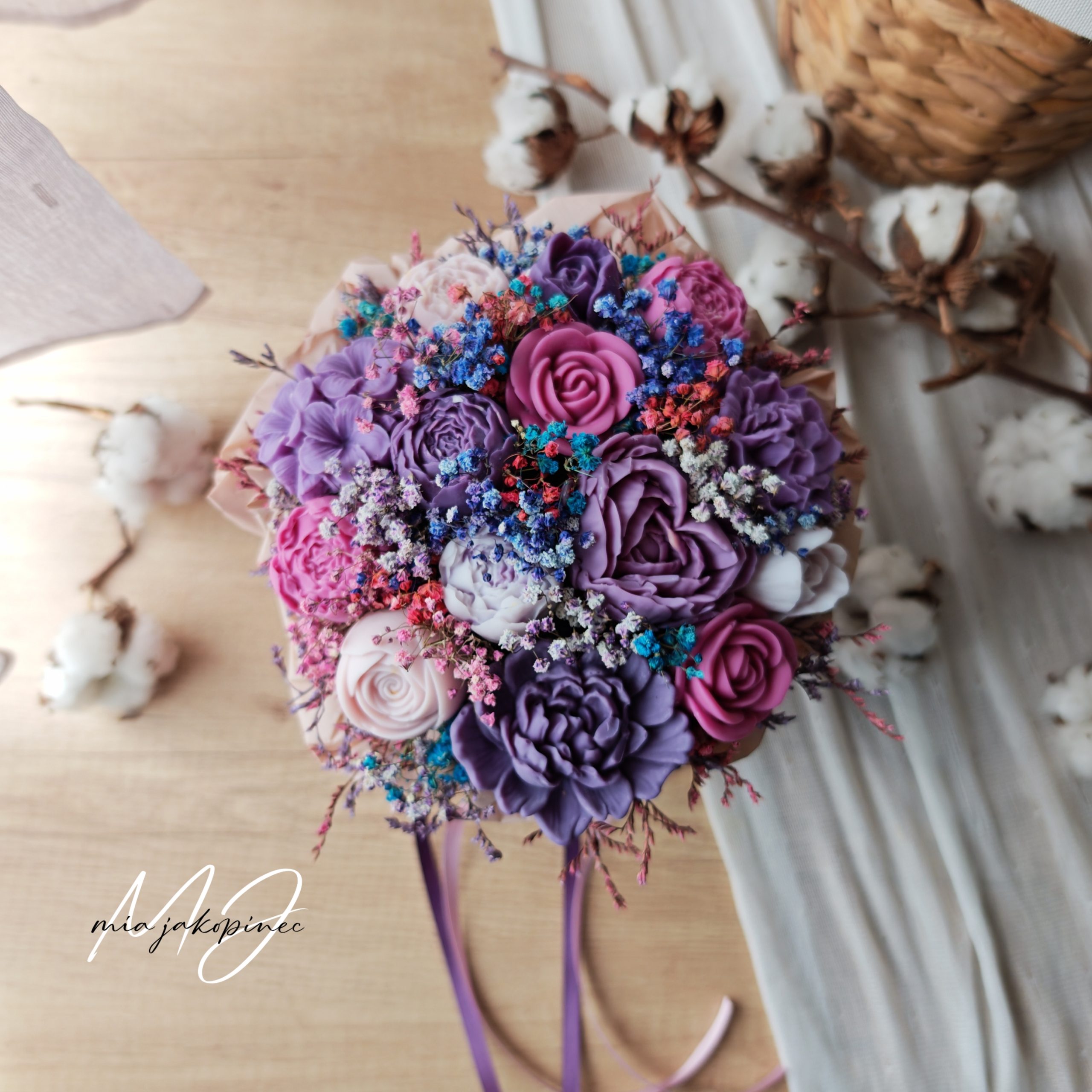 Box od sojinog mirisnog voska i suhog cvijeca. Dugotrajan mirisni aranzman. Boje i vrsta cvijeca variraju od buketa do buketa.