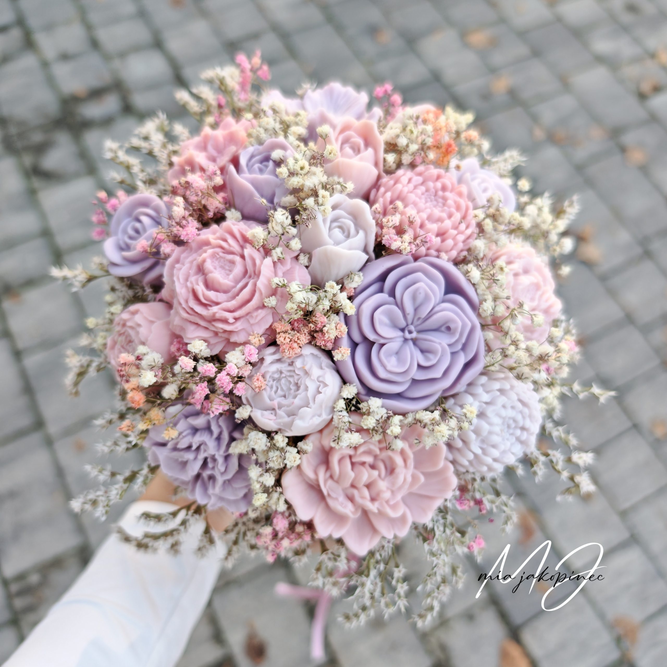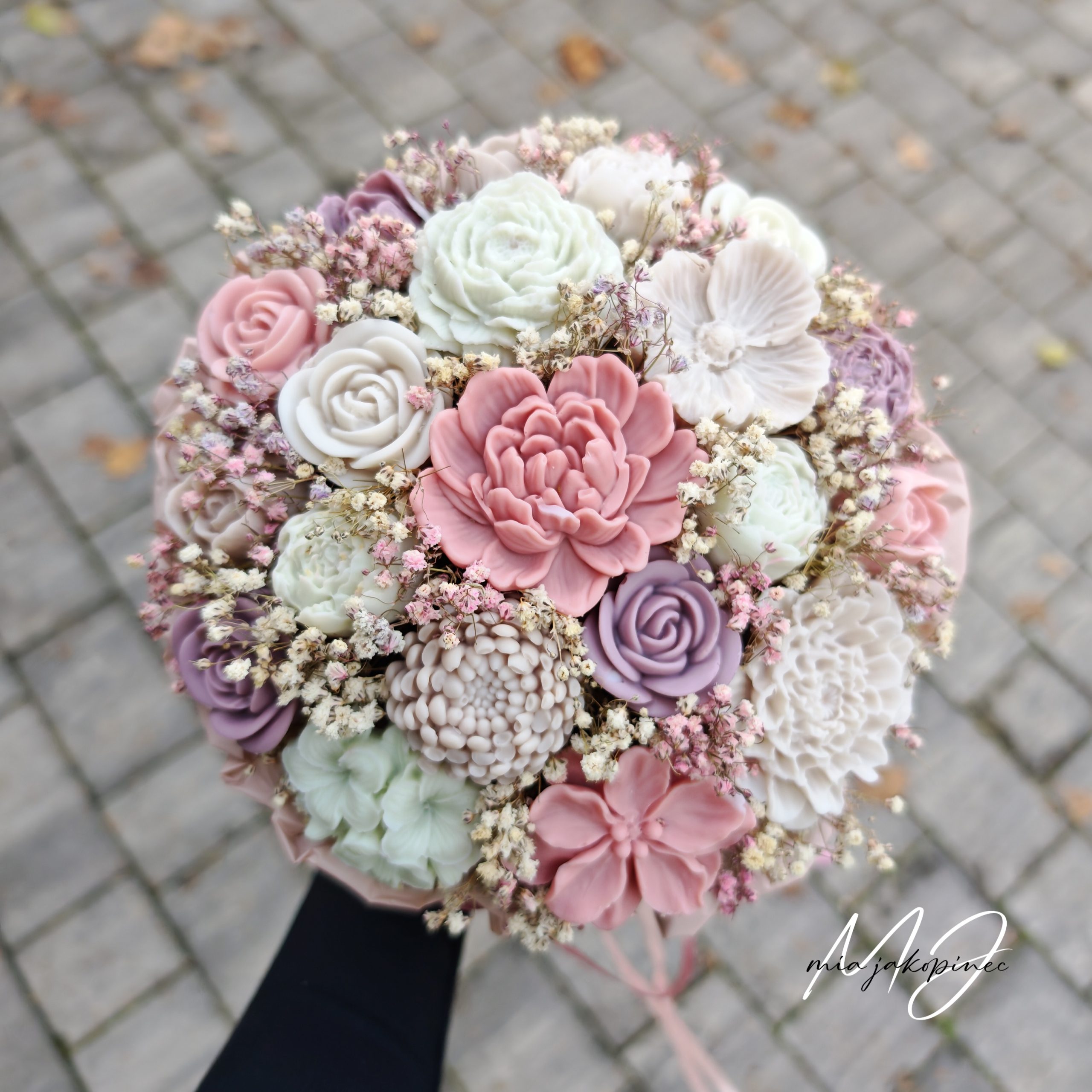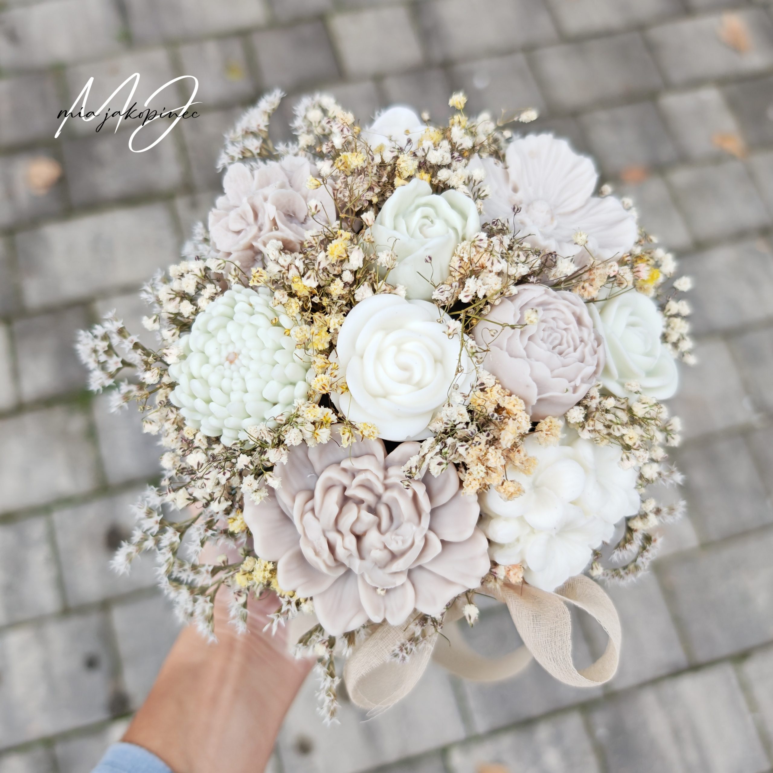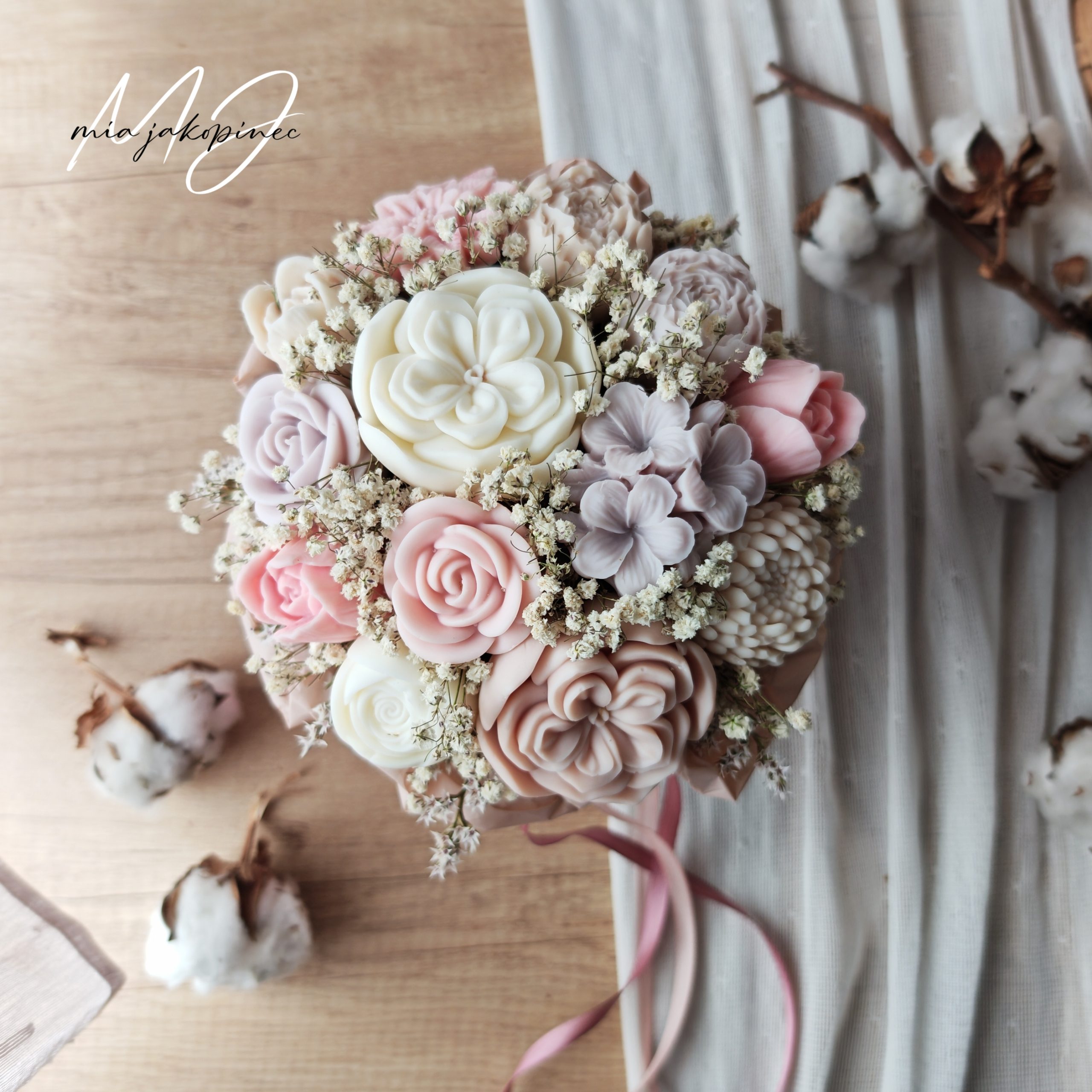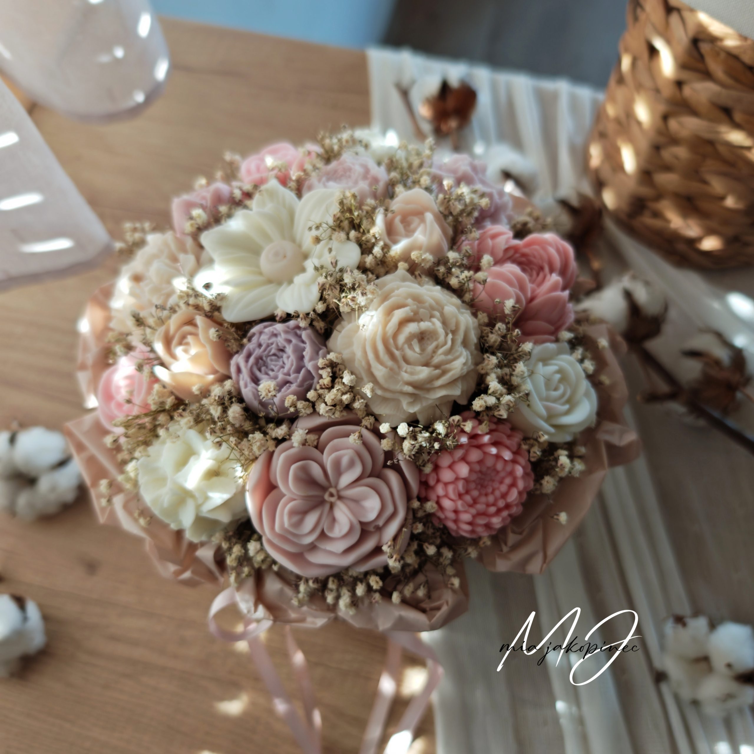 Box od sojinog mirisnog voska i suhog cvijeca. Dugotrajan mirisni aranzman. Boje i vrsta cvijeca variraju od buketa do buketa.